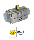Design acc. to EN 15714-3 - II 2G/D c for areas 1, 2, 21 & 22 - SIL 2 (& SIL 3 capable) - Valve mounting acc. to ISO 5211 - Limit switch box bracket connection & solenoid pilot valve connection acc. to NAMUR VDI/VDE 3845 - Rack and pinion actuator - 90° operating angle (adjustable limit screws ±5°) - Anodized aluminum body - Epoxy coated aluminium caps - Position indicator - Environment working temp.: -20°C/+80°C - Max. air supply: 8 bar - Air supply connection 1/4"